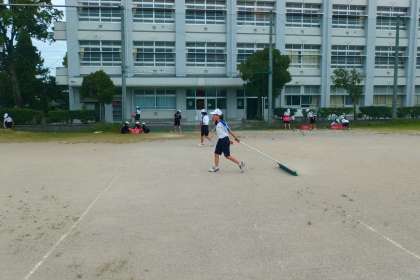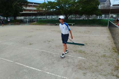 午前10時、ソフトテニス部が練習後にコート整備をしているところです。