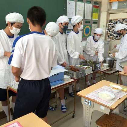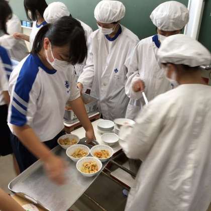 男女仲良く配膳しています 〜今日の給食 その1〜