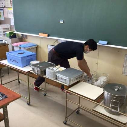 担任の先生が、一人で配膳台の上に食器や給食が入った食缶を並べていました。