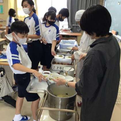 別の学級では、担任の先生が、勢いよくおかずをよそっていました。
