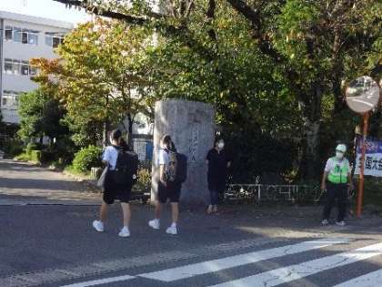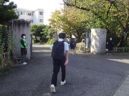 写真は正門でのあいさつ運動の様子です。