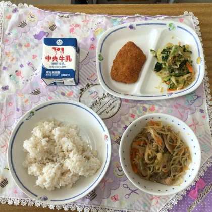 今日の献立は、麦ごはん、豚丼の具、いり大豆あえ、いか香味揚げ、牛乳でした。
