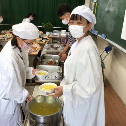 給食準備中も笑顔がいっぱいです 〜今日の給食 その1〜