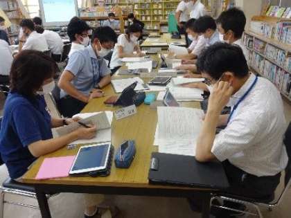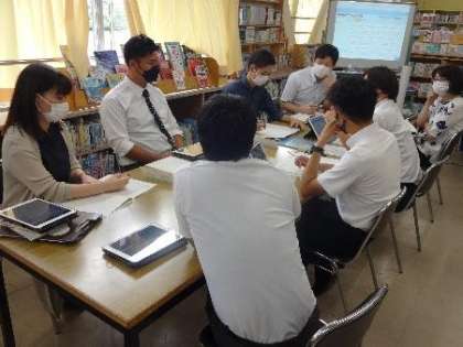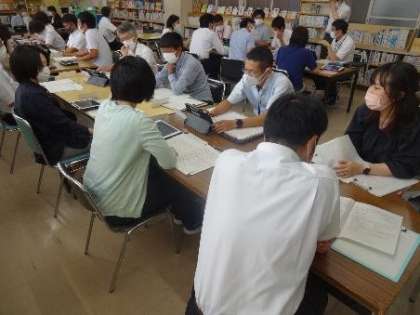 10月7日(木)の生徒下校後、図書室で1年2組の授業をもとにした研究協議会を行いました。