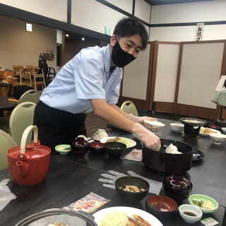 テーブルごとに代表の生徒が、ビニール手袋をつけて、皆のご飯をよそっています。