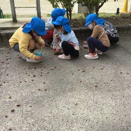 午前中は青空の下で、どんぐり拾いを楽しんでいました。