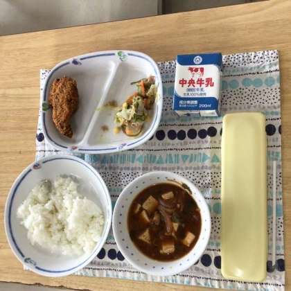今日の献立は、ごはん、みそ汁、りっちゃんの元気サラダ、カレイフライ、牛乳でした。