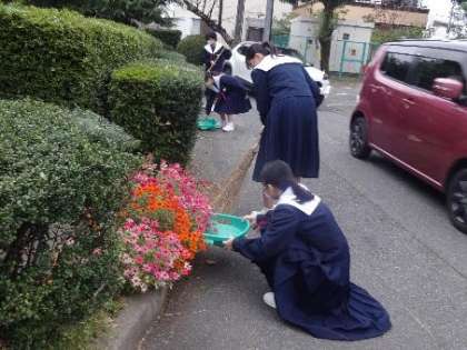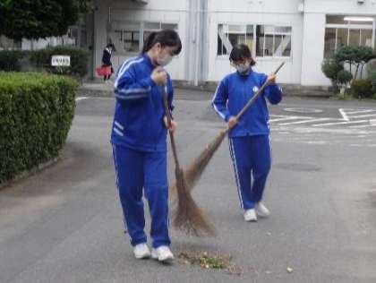 正門ロータリー付近を掃除してくれる女子生徒の様子です。