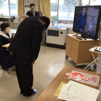 大型モニターに映る先生たちに、あいさつをしていました。