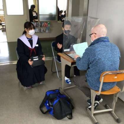 廊下では、英語の授業でALT(外国語指導助手)の先生と会話をしている1年生の姿がありました。