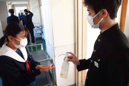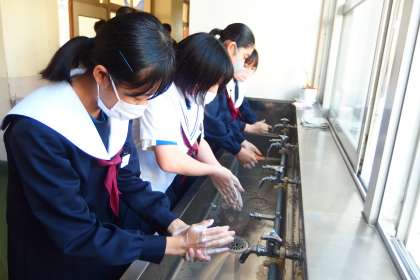 給食の前はしっかり手洗い、しっかり消毒。