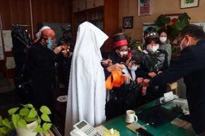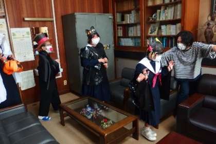 「失礼します!Happy Halloween!」の声とともに、校長室にドラキュラ、フランケンシュタイン、なぜかバッドマンなどのモンスターやお化けが乱入してきました。
