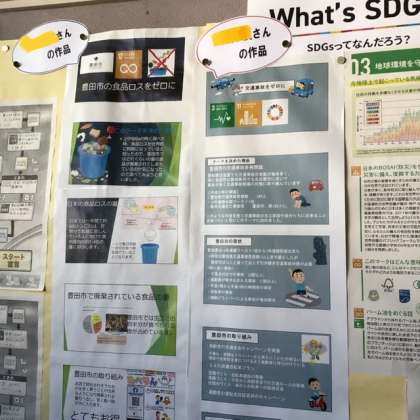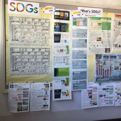 総合的な学習の時間で取り組んでいる「SDGs(持続可能な開発目標)」について、学習した内容が掲示されています。