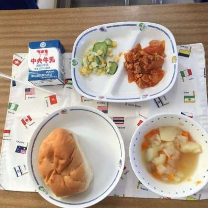 今日の献立は、りんごパン、ポトフ、コーンコールスローサラダ、とり肉のトマト煮込み、牛乳でした。