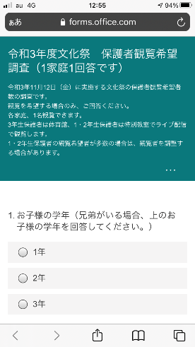 観覧会場(3年生体育館、1・2年生特別教室)の準備の都合上、できるだけ正確な人数を把握できればと思っています。