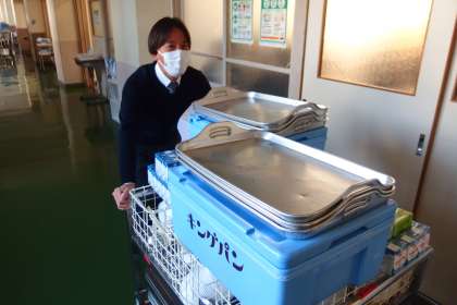 給食の時間が近くなると、4時間目の授業がない先生が、各界の配膳室から教室の前にワゴンを運んでくれて、給食の配膳がすぐに始められるようにしてくれます。