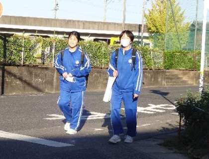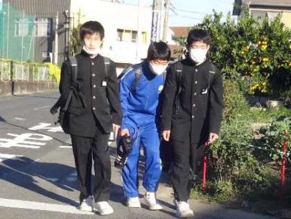 2枚目と3枚目の写真は、正門前の横断歩道を正面から朝日を浴びながら、渡ろうとしている生徒の様子です。