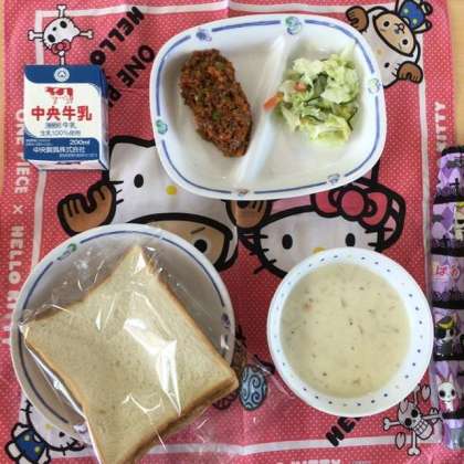 今日の献立は、スライスパン、コーンポタージュ、コールスローサラダ、スラッピージョー、牛乳でした。