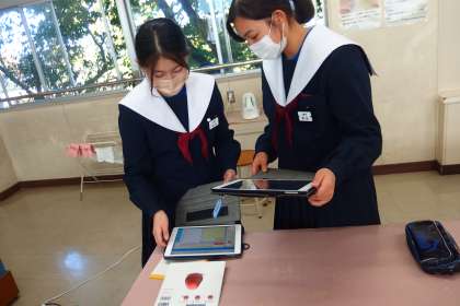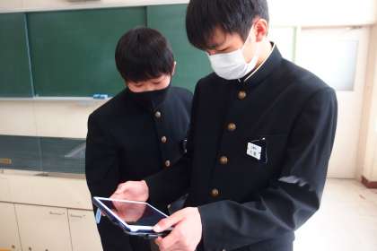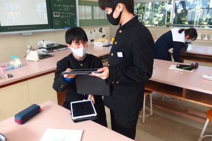 読み聞かせの練習の様子を撮影した動画を、ペアでチェックしています。