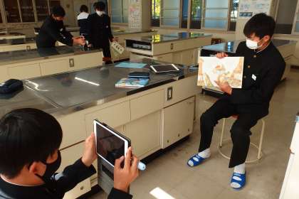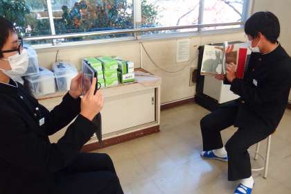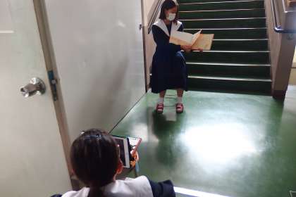 絵本の読み聞かせの様子をタブレットで動画撮影して、読み方をチェックし合っています。
