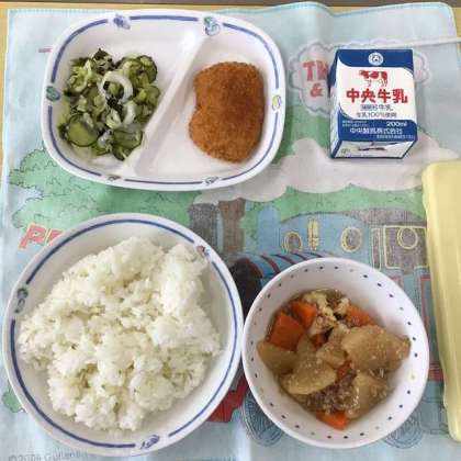 今日の献立は、ごはん、だいこんのそぼろ煮、酢の物、いか香味揚げ、牛乳でした。