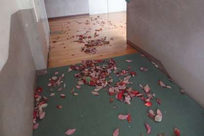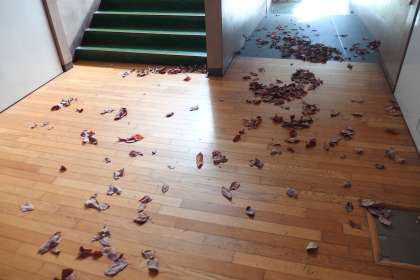 強い風で落ち葉が校舎内に大量に舞い込んでいました。