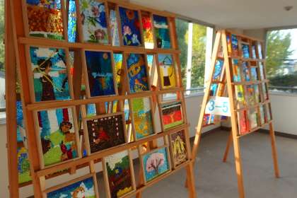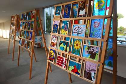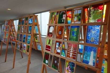 本館と北館の渡り廊下に展示されている3年生の美術作品です。