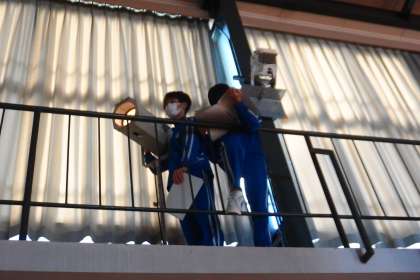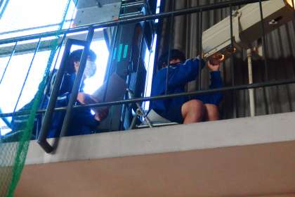 体育館の両側2階テラスに陣取る照明担当の生徒です。