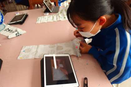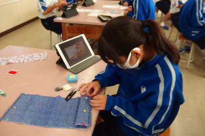 集中してまつり縫いの練習をしています。