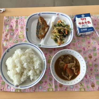 今日の献立は、ごはん、さつまいものみそ汁、ごまあえ、さばの竜田揚げ、牛乳でした。