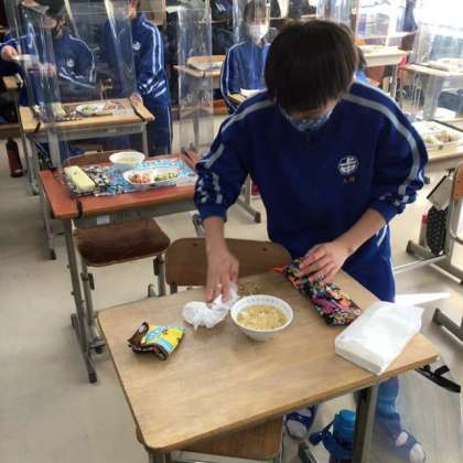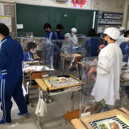 1年生は、給食時に飛沫防止のパネルを活用している学級が多いです。