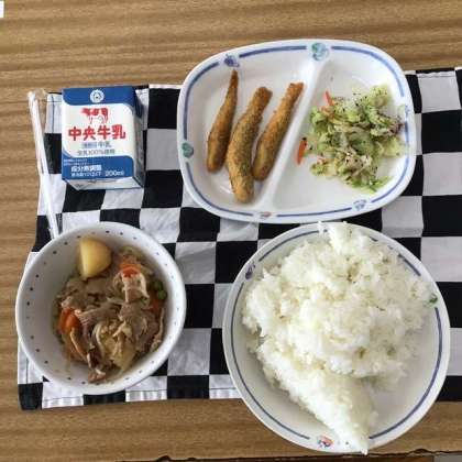 今日の献立は、ごはん、肉じゃが、ゆかりあえ、めひかりフライ、牛乳でした。