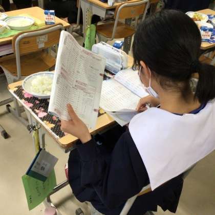 給食配膳中も、テスト勉強に余念がない生徒もいました。