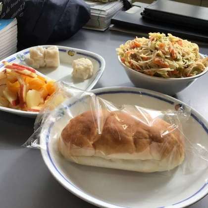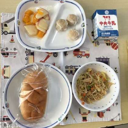 24日の献立は、米粉パン、炒めビーフン、りんごポンチ、えびしゅうまい、牛乳でした。