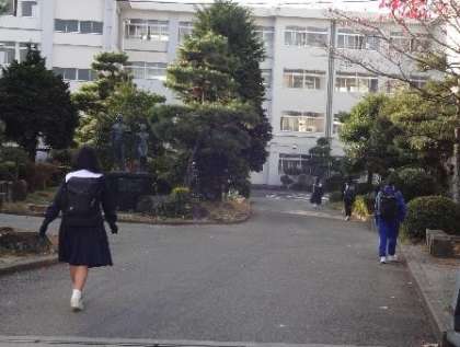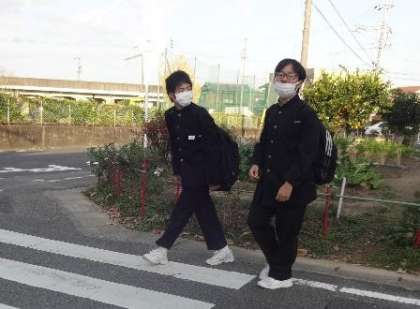 写真は、今朝の正門周辺の登校風景です。