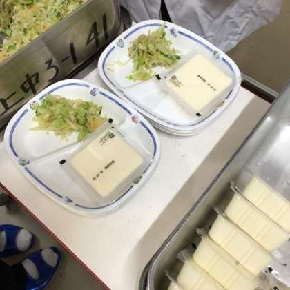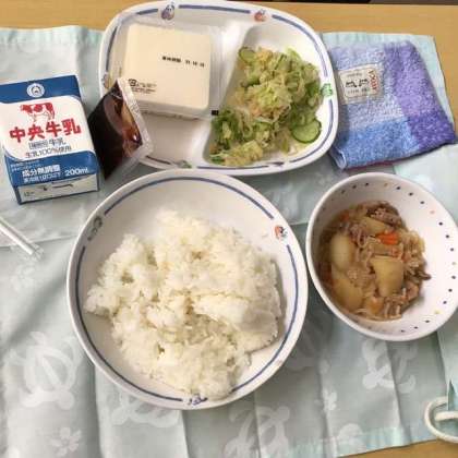今日の献立は、ごはん、肉じゃが、たくあんあえ、湯豆腐、みそたれ、牛乳でした。