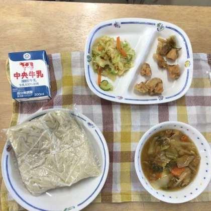 今日の献立は、ソフトめん、五目あん、中華あえ、とり肉の香味ソースかけ、牛乳でした。