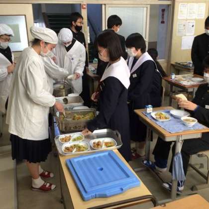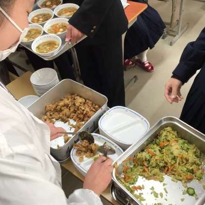 今日も、器用に両手でおかずを配膳している「二刀流」当番を見つけました。