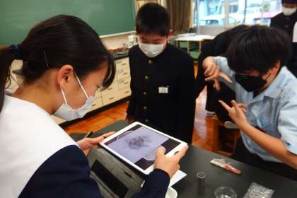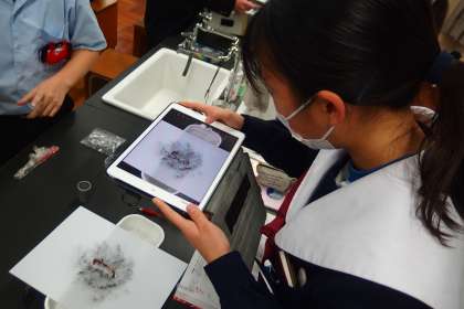 実験の途中経過、最終結果をタブレットパソコンで記録しています。