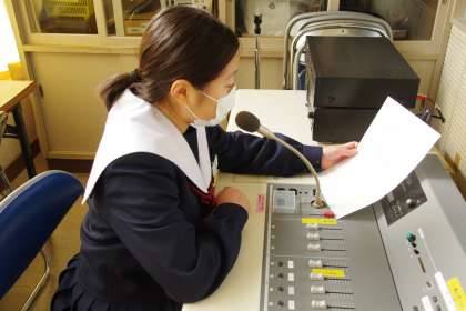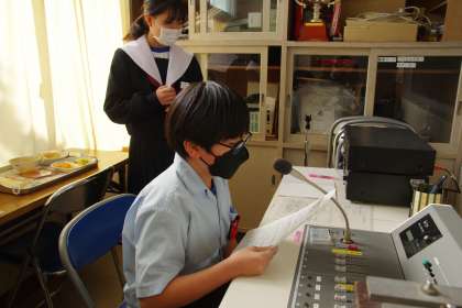 お昼の放送を担当してくれた放送委員と給食献立一口メモを紹介してくれた給食委員と図書室からのお知らせを伝えてくれた図書委員です。