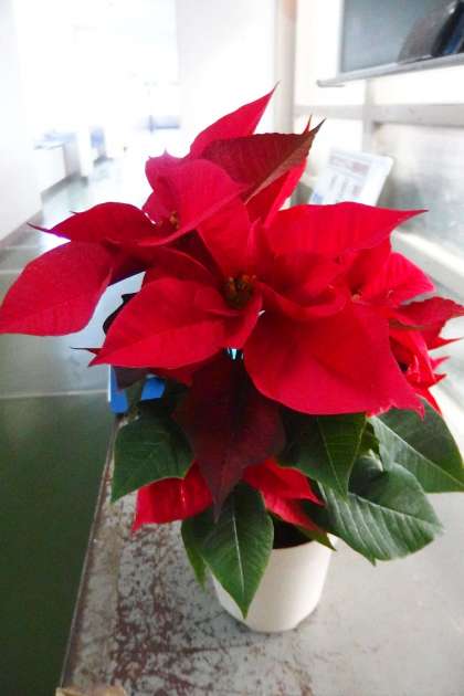 この季節らしいポインセチアの鉢植えを発見しました。 1年生の階です。