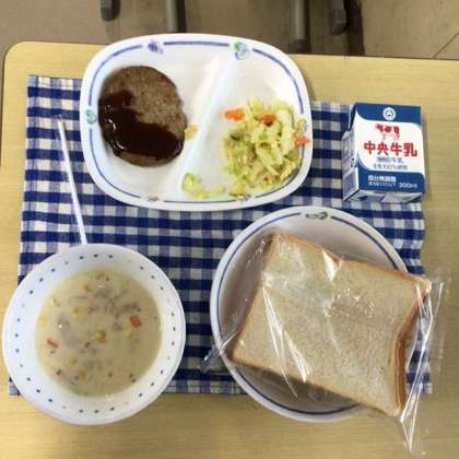 今日の献立は、スライスパン、コーンチャウダー、ナッツサラダ、ハンバーグ、牛乳でした。