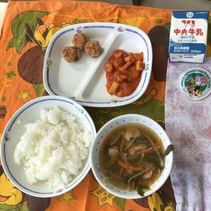 今日の献立は、ごはん、はるさめスープ、いかとえびのチリソース煮、揚げしゅうまい、牛乳でした。