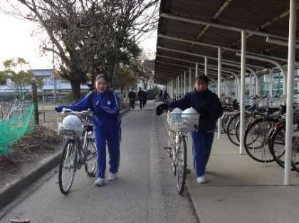今朝の自転車置き場付近の登校風景です。