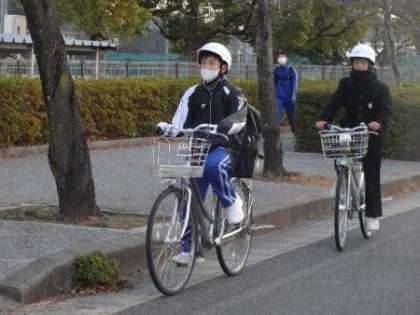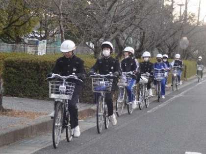 自転車は一列で、歩行者はせいぜい二列で登下校するようにしましょう。