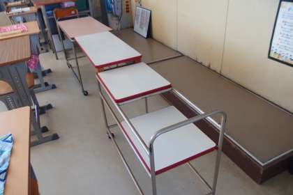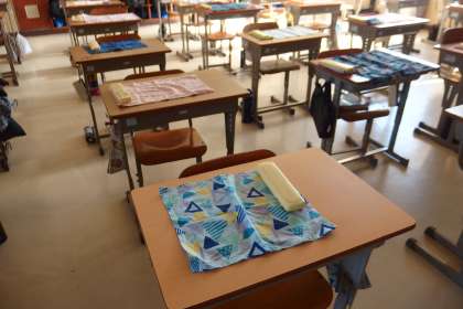 移動教室で誰もいませんでしたが、戻ってきたときに給食の準備がすぐにできるように、配膳台が用意され、一人一人の机の上にはランチョンマットも準備されていました。