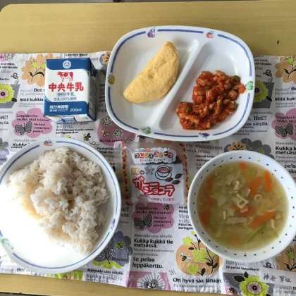 メニューは、パスタスープ、チキンライス、オムレツ、ガトーショコラ、牛乳でした。