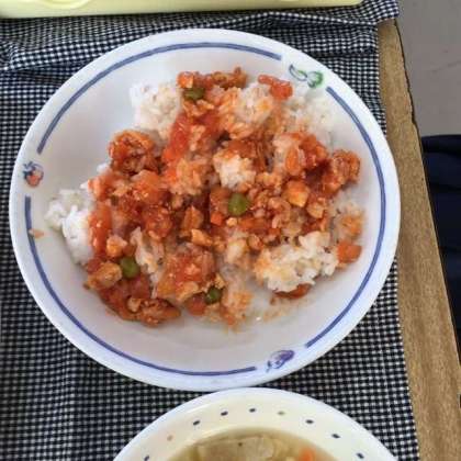 チキンライスは、麦ごはんに別添えのチキンライスの具を自分で混ぜるものでした。