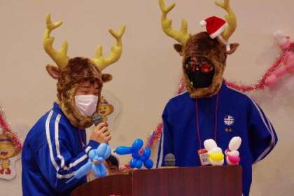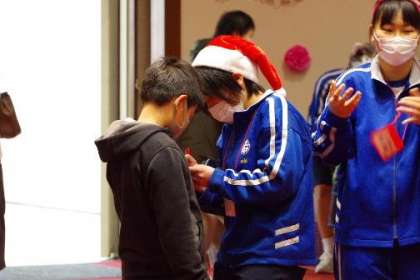 写真は、上郷クリスマス会で活躍するボランティア生徒の様子です。