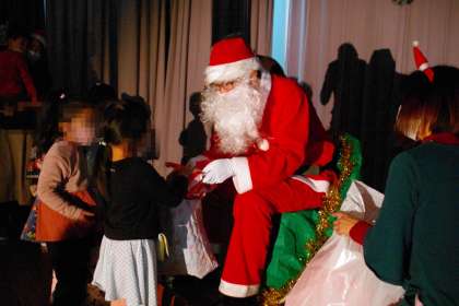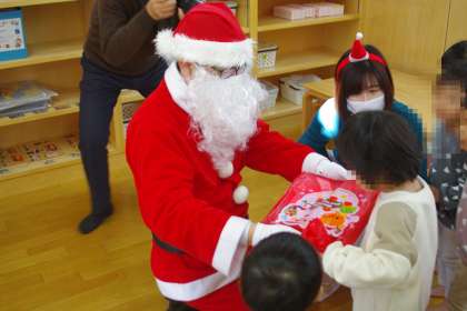 メガネをかけたサンタクロースが来園して、園児のみなさんにクリスマスプレゼントを配っていました。